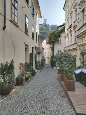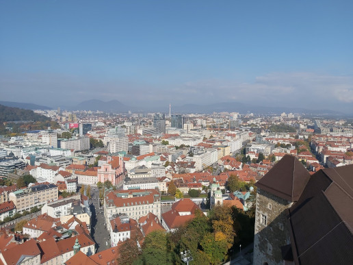 som stora besökare en djup inblick i chokladens spännande värld. Utöver att man kan köpa utsökta praliner i butiken kan man delta i work shops och få göra sin egen signatur-chokladkaka med valfri topping. För en ”chokladoman” som jag är denna plats himmelriket. Ett måste när man är här första gången är självklart ett besök på slottet (The Ljubljana Castle » The Ljubljana Castle) som vakar över staden. Det är lätt att ta sig dit och utsikten är oemotståndlig. En klar, solig dag kan man se cirka 2/3 av landets yta. Känner man sig sugen på något att äta eller dricka så finns där både vinbarer och restauranger.